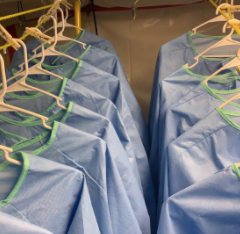 N-95 respirators straps are marked each time they pass through a decontamination cycle. The Food and Drug Administration (FDA) allows for the respirators to be processed with hydrogen peroxide up to 20 times. The PPE is then packaged for delivery.